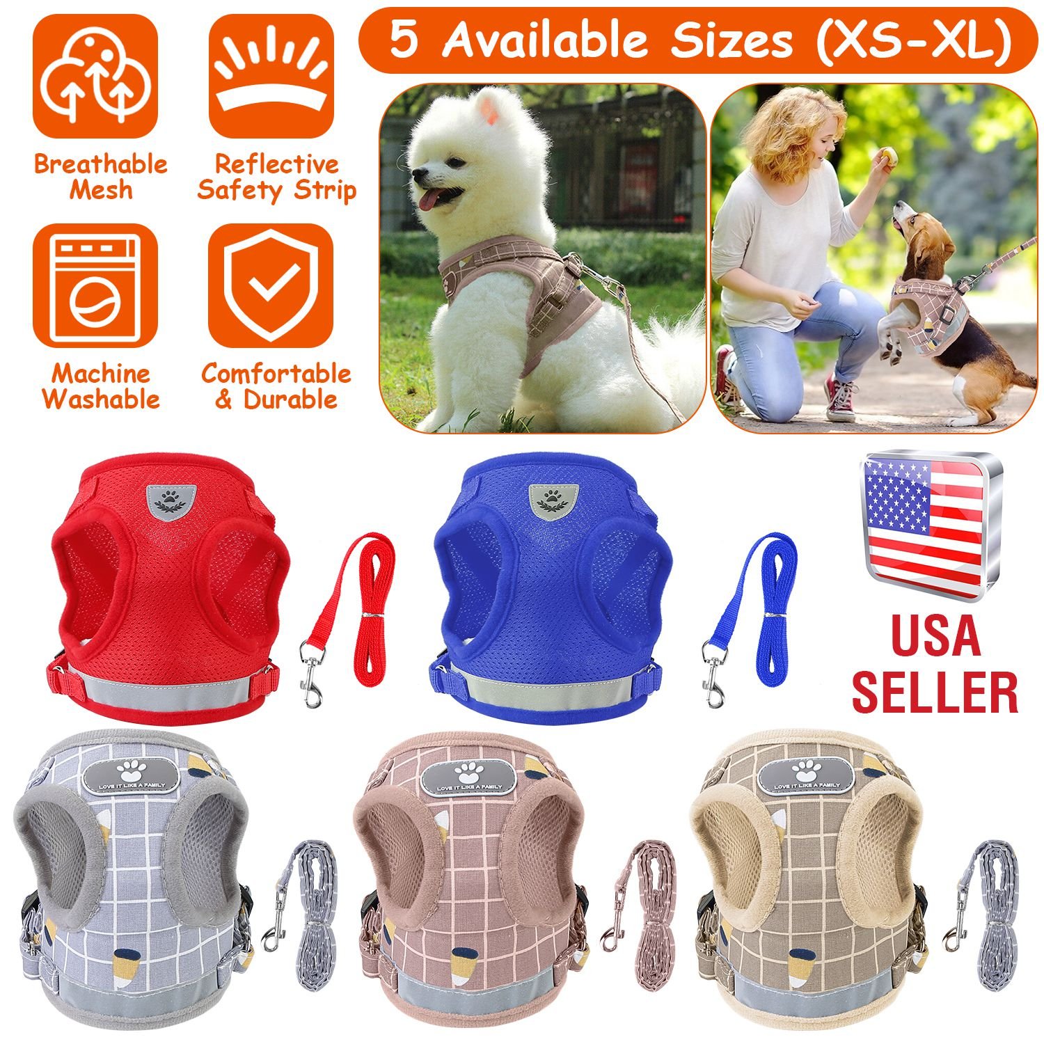 Made of 100% polyester with soft edges and breathable mesh padding, come with adjustable harness and paste strip, our pet chest strap can provide extra comfort and protection. A long reflective strap makes your dog more visible and safe in dark, great for going out at night. 360° Rotatable clasp and 3.94ft leash allow your dog to play outside with freedom. Five sizes and colors are provided for more choices.